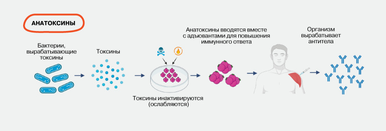 Для приготовления анатоксинов патогенные микроорганизмы уже не используются – берут только их токсины, предварительно дезактивированные. То есть вместо чужака-актера приносят его незаряженный автомат. Анатоксины используются для профилактики дифтерии, столбняка, газовой гангрены.