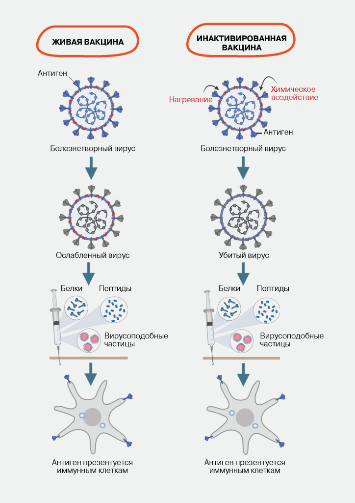 Например, в основе живых (или аттенуированных) вакцин – микроорганизмы с пониженной вирулентностью. Это настоящие возбудители инфекций, реальные чужаки, но они не умеют драться: такой способности их лишили в лабораторных условиях. Гарнизон их разглядывает, фотографирует, тренирует бойцов на будущее, но настоящей битвы, которая была бы с боеспособными патогенами, не происходит, силы гарнизона не расходуются. Живые вакцины делаются для профилактики желтой лихорадки, кори, краснухи, полиомиелита, эпидемического паротита, ветряной оспы, гриппа и др.