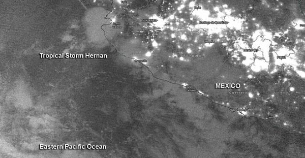 Ночные снимки, полученные со спутника NASA-NOAA, показали тропический шторм Эрнан в восточной части Тихого океана вдоль побережья западной Мексики. К выходным ожидается, что Эрнан поглотит близлежащий тропический шторм Изель.