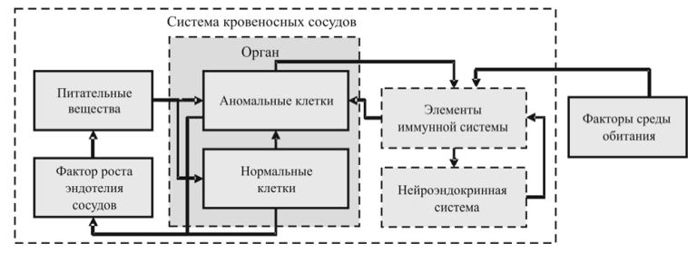 Математическая модель представлена в виде системы, состоящей из 19 уравнений, которые описывают динамикуизменения концентрации аномальных клеток, включая процессы их образования, уничтожения и нейтрализации антителами. Также модель учитывает поступление питательных веществ, влияющих на рост опухоли, и механизм формирования новых кровеносных сосудов под действием выделяемых раковыми клетками ферментов.