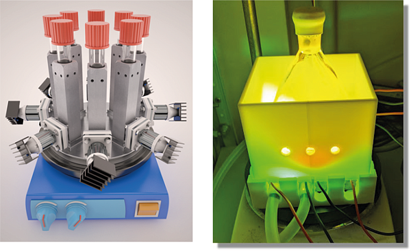 Рисунок. Модель, иллюстрирующая одновременное проведение нескольких экспериментов с использованием компактных металлических фотореакторов (слева) и фотохимический синтез большого количества вещества в реакторе, изготовленном в лаборатории методом наплавления термопластичного полимера (справа). Источник: Евгений Гордеев