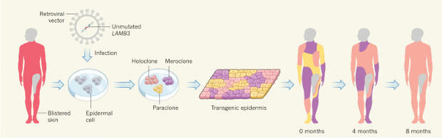 Ученые и врачи из Германии и Италии два года назад смогли заменить 80 процентов кожи мальчика, страдающего буллезным эпидермолизом, трансгенной кожей из его собственных клеток. Болезнь не проявлялась вновь. Исследование опубликовано в Nature, – пишет N+1.Буллезный эпидермолиз (БЭ) — генетическое заболевание, для которого характерно образование пузырей и эрозий на коже и слизистых оболочках, а также чувствительность кожи к незначительным травмам. БЭ делится на три основных типа: простой, пограничный, дистрофический, которые определяются уровнем образования пузырей в слоях кожи. При пограничном типе, которым страдал пациент, пузыри образуются на уровне светлой пластинки (lamina lucida).