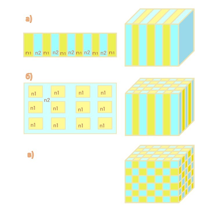 Модели оптических метаматериалов: а) одномерные; б) двумерные; в) трехмерные