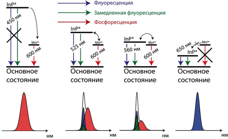 «Наличие примеси марганца приводит к появлению нового люминесцентного эффекта — “задержанного” переноса возбуждения, — пояснил Дмитрий Певцов, инженер-технолог лаборатории фотоники квантово-размерных структур МФТИ. — Суть эффекта заключается в возможности наблюдения переноса возбуждения на больших временах порядка миллисекунд, соответствующих продолжительности фосфоресценции, то есть времени жизни возбуждения на примесном ионе двухвалентного марганца, причем перенос происходит по короткоживущим уровням квантовых точек».