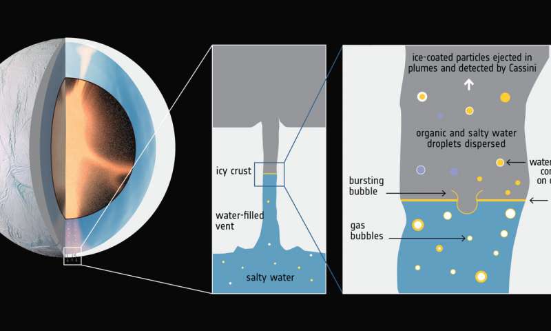 Новое исследование группы ученых из Гейдельбергского университета Германии во главе с Фрэнком Постбергом и Нозаиром Хаваджа выявила фрагменты крупных органических молекул в этих выброшенных ледяных зернах. По сообщению авторов, это первая находка сложных органических веществ из внеземного водного мира. «Мы выявили большие молекулярные фрагменты, которые имеют структуру, характерную для сложной органики. Эти огромные молекулы содержат сеть атомов углерода, водорода, кислорода и азота, которые образуют кольцеобразные и цепные субструктуры. Возможно, фрагменты имеют гидротермальное происхождение, являются результатом взаимодействия океана и ядра Энцелада, т.к. при высоких давлениях и температурах могут возникать сложные органические молекулы»