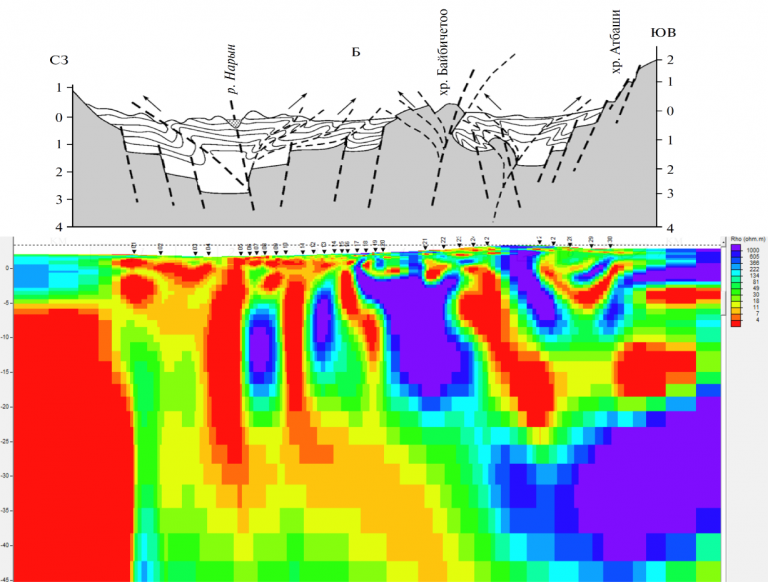 Упрощенный геолого-геофизический разрез через хребет Байбиче-Тоо и прилегающие части Нарынской и Атбашинской впадин. Верхняя панель: серым цветом показан палеозойский фундамент; белым — кайнозойский чехол; пунктиром — разломы, секущие породы фундамента и разломы в чехольном комплексе. Нижняя панель: двухмерная геоэлектрическая модель по профилю «Карабук» (Нарынская впадина — поднятие Байбиче-Тоо — Атбашинская впадина), значения электросопротивления в модели показаны цветом: оттенки красного — проводящие структуры; синего — высокоомные объекты. Источник: Елена Баталева