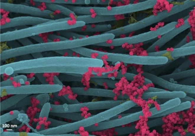 Ученые ввели SARS-CoV-2 в лабораторные эпителиальные клетки бронхов человека, которые создают барьер между воздухом в легких и кровотоком, и оставили их смешиваться на 96 часов, а затем использовали сканирующий электронный микроскоп для фиксирования результатов.