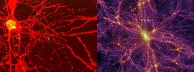 По оценке исследователей, несмотря на огромную разницу в масштабах этих систем, они обладают схожими уровнями сложности и самоорганизации. Так, в человеческом мозгу в среднем находится около 69 миллиардов нейронов, в то время как Вселенная состоит из как минимум 100 миллиардов галактик. В обоих ситуациях эти значения составляют примерно 30 процентов от общей массы системы, а остальные 70 заняты в одном случае тёмной энергией, а в другом - водой.