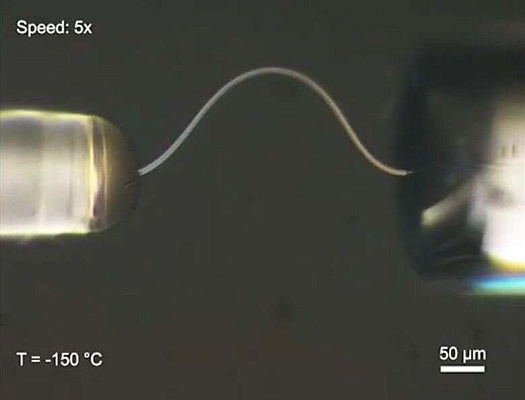 После этого температура в камере была сброшена до значений от -70 до - 150 градусов по Цельсию. При достижении самого низкого значения эластичность микроволокон увеличилась. Теперь эти лëдные структуры можно свернуть в форму петли, радиус которой равен 20 микрометрам. В этом случае коэффициент эластичности льда составил 10.9, что намного ближе к теоретико-физическому значению.