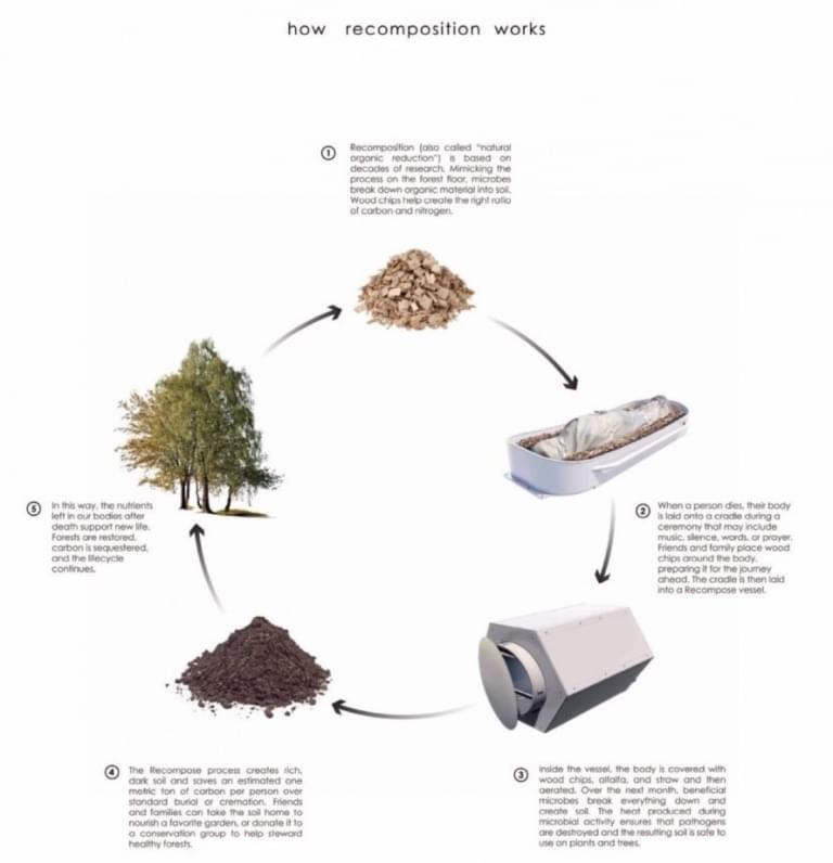 Основатели стартапа считают, что их вариант погребения — боле современная альтернатива традиционным видам захоронений и кремации. Услуга получила название «естественного органического восстановления». В Recompose уверяют, что предлагаемый ими вариант захоронения позволяет сократить выброс диоксид углерода в атмосферу, делая их способ погребения самым экологичным.