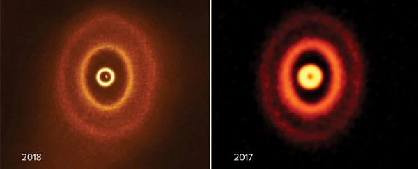 «Наше моделирование показывает, что гравитационное притяжение от тройных звезд само по себе не может объяснить наблюдаемое рассогласование, — сказал астроном Нинке ван дер Марель из Университета Виктории. — Мы думаем, что присутствие планеты между этими кольцами может объяснить то, почему диск оказался разорван, она, вероятно, образовала пылевую прослойку и сломала диск в месте нынешнего внутреннего и внешнего колец».