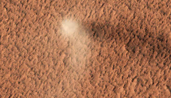 Ещё в октябре 2019 года исследовательский орбитальный аппарат NASA смог сделать серию снимков, на которых запечатлён впечатляющий «пылевой дьявол». Разведывательный орбитальный зонд сделал фотографии при помощи HiRISE, мощной камеры, которая делает снимки марсианской поверхности с 2006 года.