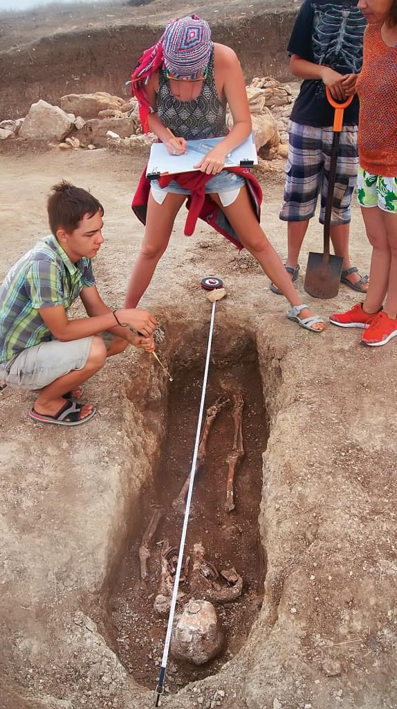 – Обычно греки хоронили своих умерших просто вытянутыми на спине, – продолжает Берлизов. – Хоронили на рассвете. Это считалось лучшим временем для похорон, потому что всевозможные ночные демоны как раз уходят отдыхать, а дневные еще не проснулись, а значит, ни те, ни другие не причинят умершему никакого вреда. За это время можно быстренько похоронить. Темечком к восходу и лицом на закат – чтобы он был повернут к священной реке мертвых Стикс. Хотя традиции, конечно, могли перемешиваться – как я уже сказал, Боспорское царство в те времена было многонациональным: папа мог быть греком, мама – скифянкой, дедушка – тавром. Каждый мог вносить свою лепту в погребальный обряд. А вообще об этом тогда мало кто задумывался – как люди знали, так и хоронили – по-своему, не так, как сейчас… Дети, не подкапывайтесь сильно под кости – там могут быть бусины, фибулы, за щекой может быть монета... Древние греки верили, что душа умершего, переправляясь через Стикс, должна дать перевозчику Харону монету, дабы тот переправил ее через реку. Поэтому клали ее либо в руку, либо за щеку.