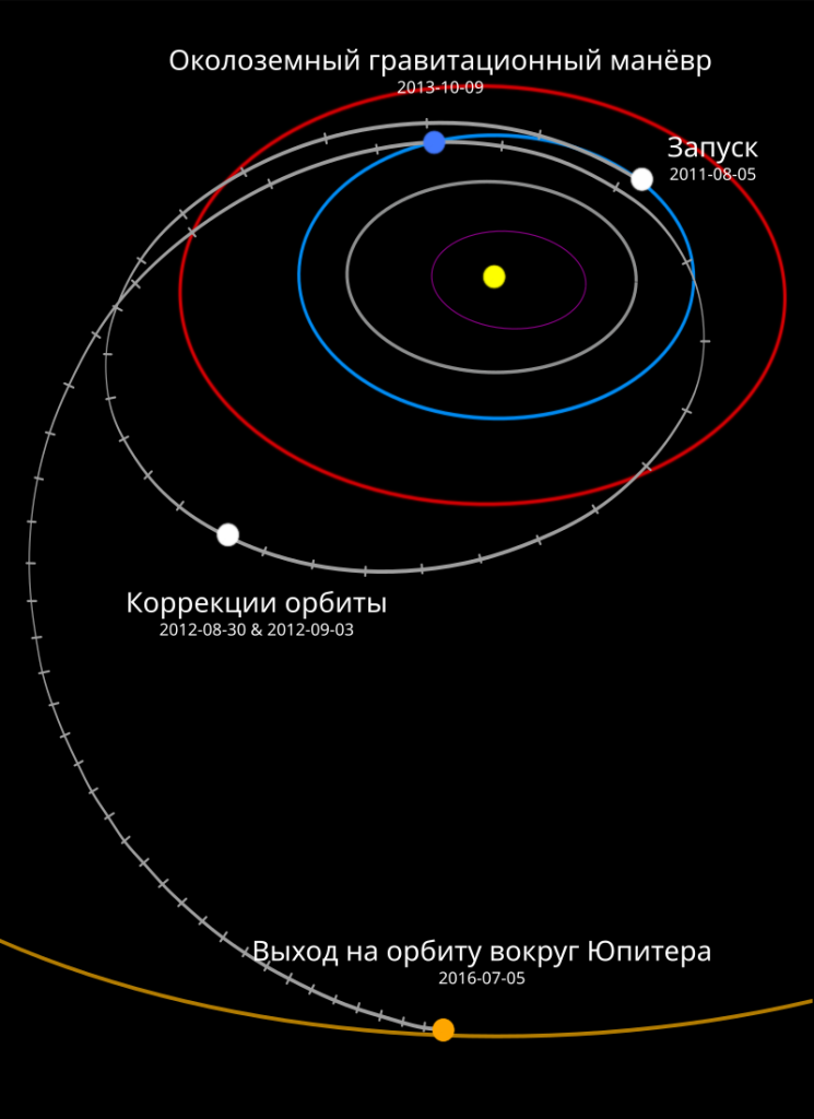 Путь «Юноны» с Земли к Юпитеру занял пять лет. Запустили зонд на самой мощной конфигурации ракеты «Атлас V», однако для прямого пути к цели даже ее усилий не хватило бы. Поэтому траектория получилась несколько замысловатой. Аппарат вылетел за пределы орбиты Марса, где провел крупную корректировку орбиты с помощью двигателя, а потом вернулся во внутреннюю часть Солнечной системы, чтобы совершить гравитационный маневр около Земли спустя два года после запуска.