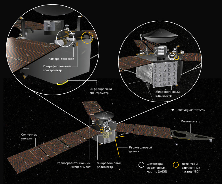 – Детекторы заряженных частиц (JADE и JEDI) – предназначены для регистрации электронов и ионов высокой и низкой энергии. Учитывая непростую радиационную обстановку вокруг Юпитера, эти датчики позволяют изучать характеристики заряженных частиц, которыми заполнено пространство около планеты, которые создают полярные сияния, радиационные пояса, взаимодействуют с солнечным ветром и так далее;