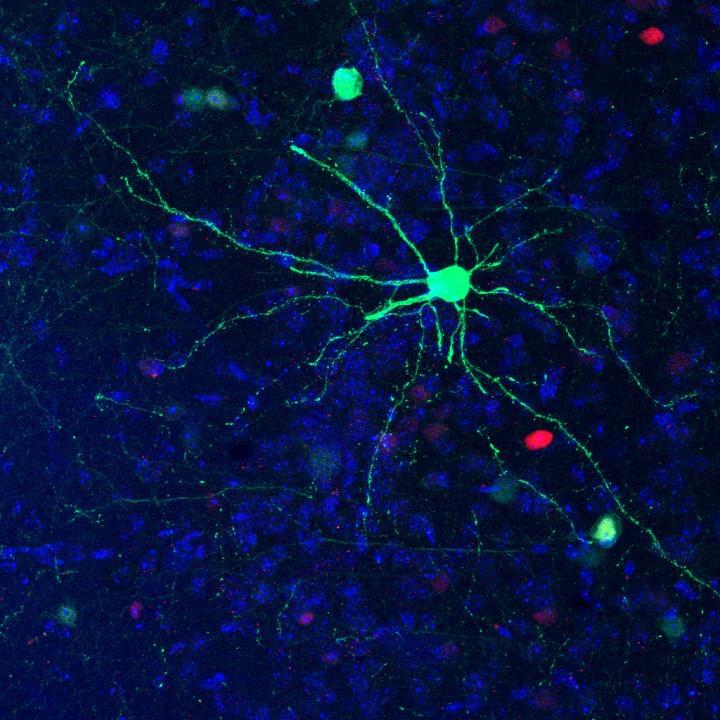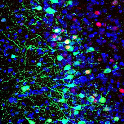 На фото: Пирамидные клетки в предлимбической коре мыши (показаны синим цветом), которые были активны во время формирования дискретной памяти (показано зеленым цветом). Обычно считалось, что эти клетки менее активны при первоначальном формировании памяти (или вскоре после, например, один день спустя) и становятся более активными с течением времени (когда доступ осуществляется в более отдаленные моменты времени, например, через 21 день).