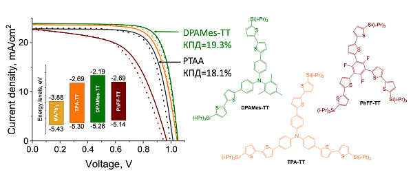 Физики получили три звездообразные малые молекулы DPAMes-TT, TPA-TT (на основе трифениламина) и PhFF-TT (на основе трифторбензола). Эффективность полученных молекул сравнивалась с параметрами PTAA, широко применяемого в перовскитных солнечных элементах.