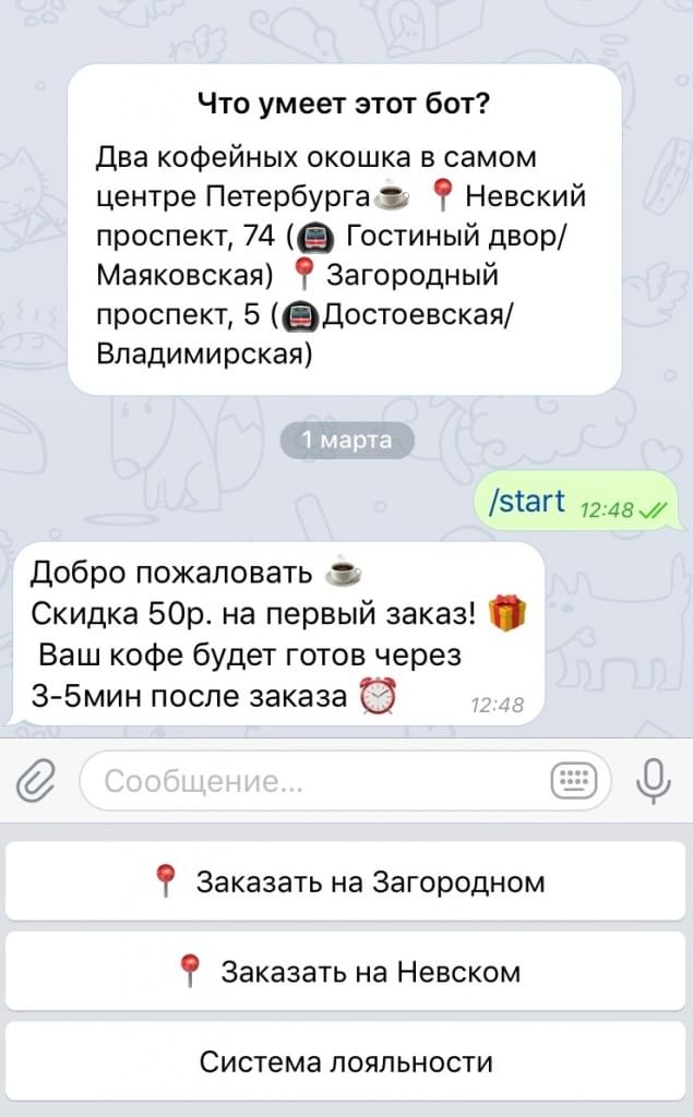 В Петербурге кофейня в окне Fenster создала телеграм-бота @fenstercoffeebot. Через него можно заранее заказать кофе, если вы на подходе к кофейне и не хотите стоять и ждать.
