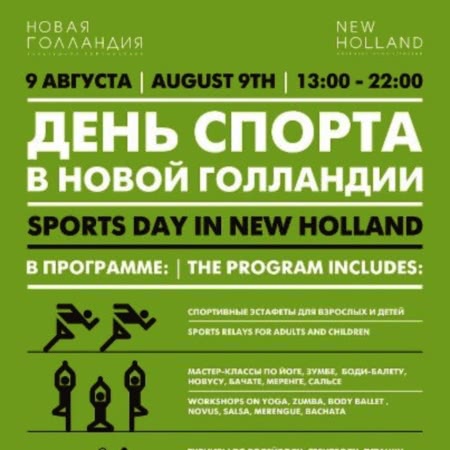 Это воскресенье станет в Новой Голландии «Днем спорта». С 13.00 до 22.00 вы сможете участвовать в бесплатных занятиях и соревнованиях по танцам, настольному теннису, зумбе, волейболу, стритболу, йоге, балетной гимнастике, петанку и другим видам спорта.