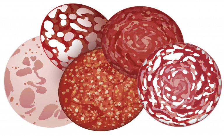 Еще одна любимая россиянами колбаса – краковская. В 1938 году в состав полукопченой краковской колбасы входили говядина первого сорта, полужирная свинина и специи: черный и душистый перец, чеснок, сахар, соль и все та же селитра. Сегодня в краковскую тоже кладут свинину и говядину. А еще глутамат натрия (самую распространенную пищевую добавку – Е621), чтобы придать колбасе более насыщенный вкус, и цитрат натрия (Е331) – для повышения плотности продукта.