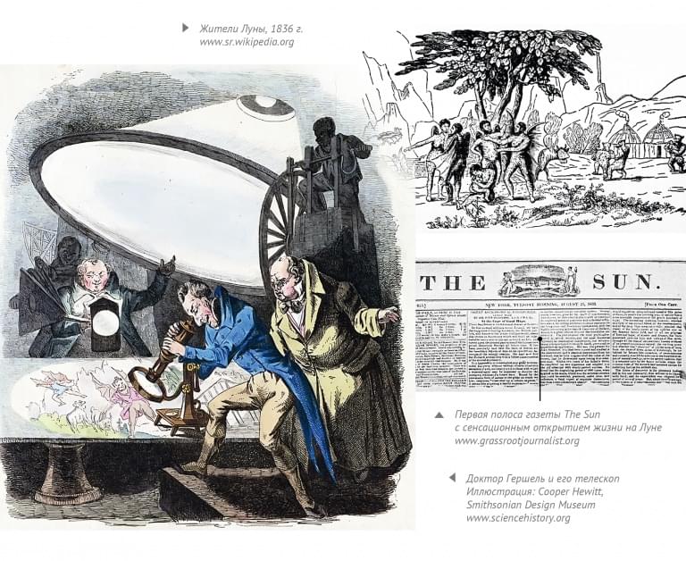 В первой половине XIX века газета The Sun опубликовала шесть статей, утверждающих, что на Луне существует жизнь. Журналисты рассказывали, что на спутнике обитают бизоны, козы синего цвета, рогатые медведи, единороги, двуногие бобры и раса мышелюдей. В статьях они ссылались на эдинбургский научный журнал и британского астронома сэра Джона Гершеля-младшего, который создал телескоп, позволяющий детально разглядеть объекты в космосе. Автором статей был «доктор Эндрю Грант», якобы коллега Гершеля. В шестой статье написали, что наблюдения через телескоп прекращены из-за его повреждения. Продажи The Sun выросли в несколько раз. Обман быстро раскрыли другие ученые.
