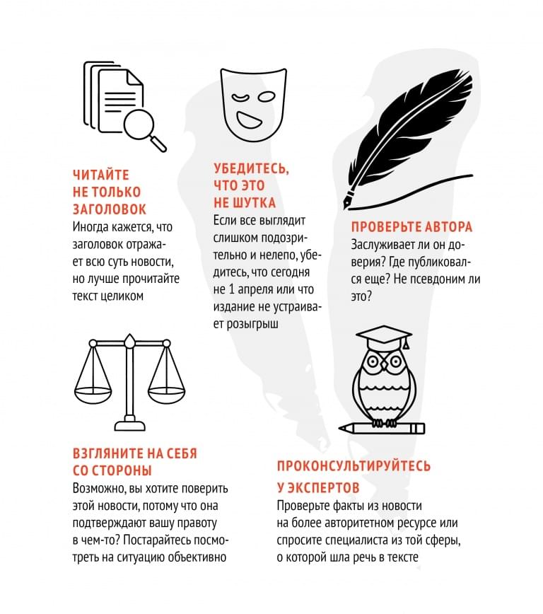 Хотя авторы фейков довольно хитры, есть множество способов не попасться на их удочку. Всегда проверяйте дату публикации – фейк ньюс любят вытаскивать из подвалов устаревшие инфоповоды, о которых все забыли. Проверяйте, кто еще написал об этом, – вряд ли вы найдете больше 10 сайтов, опубликовавших эту историю. А те недо-СМИ, которые опубликовали, будут выглядеть подозрительно и называться как-нибудь вроде «Новостной вестник привокзальной площади Астрахани». Все фальшивые новости, даже на разных сайтах, пишутся однотипно – обычно это перечисление одного и того же разными словами, а про экспертов и конкретных источников речи не идет. В тексте используются сильные эпитеты, помогающие нагнетать обстановку: «Совсем маленькие дети в смертельном состоянии оказались в больнице после того, как…» Еще отличить лживый текст можно по стилистическим и грамматическим ошибкам, смысловым и логическим недоработкам в новости.