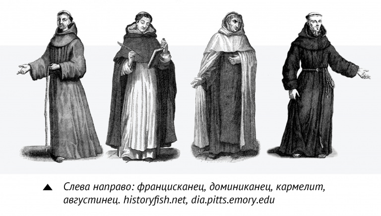 Доминиканцы, августинцы, кармелиты – нищенствующих орденов было довольно много. Собранные в странствиях деньги братья должны были приносить в монастырь. Число таких обителей было огромно: например, к XVIII веку у францисканцев было 1700 монастырей, к которым было приписано около 25 тыс. монахов. А орден доминиканцев в эту же эпоху насчитывал свыше 30 тыс. членов.