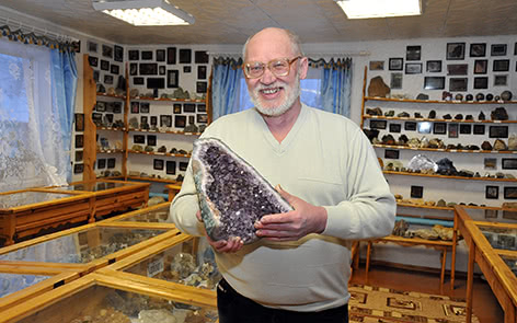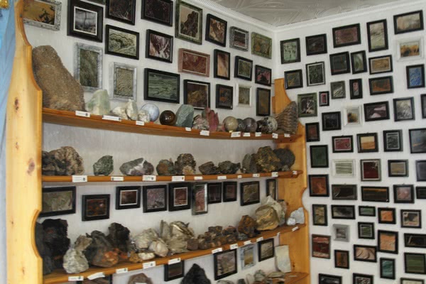 Коллекция началась с куска пирита, подаренного знакомым геологом, и в первые годы умещалась на подоконнике. Потом переместилась в ящики. А потом Сирота стал строить дом и отвел под нее целый второй этаж. Сейчас здесь более 700 экспонатов. Сирота помнит каждый из них: как называется, из каких краев, из какого года, а для посетителей все классифицировано. На стенах - картинки из камня в базальтовом обрамлении. Хозяин обрабатывает камень сам, у него целый парк станков, который помогли создать местные мужики.
