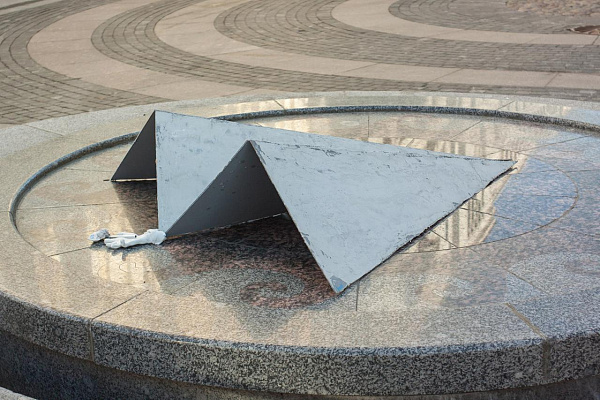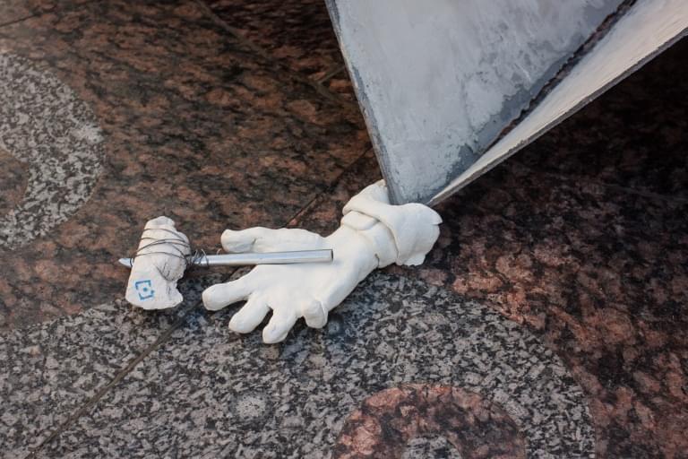 Арт-объект называется «Бумага кроет камень» и посвящен противостоянию чиновников и мессенджера Telegram