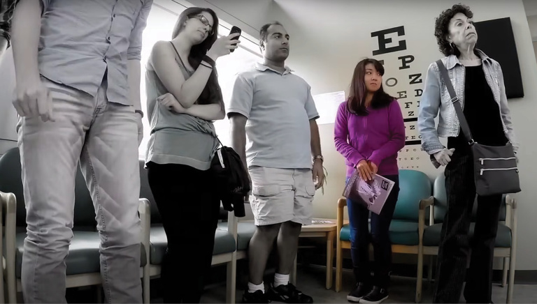 Эксперимент проводится в очереди к врачу. Все ожидающие люди – подставные, кроме одной девушки. Каждые несколько минут раздается звуковой сигнал, и актеры встают со своих мест на несколько секунд, а затем опускаются обратно. Девушка пропускает первые несколько сигналов и не поднимается с места вместе с толпой, наоборот, странно их оглядывает. Но пациенты делают это абсолютно безэмоционально, как что-то само собой разумеющееся. Всего после трех сигналов девушка присоединяется к группе и начинает действовать по ее правилам. Хотя никакого логического оправдания у данного действия нет. Так продолжается какое-то время.