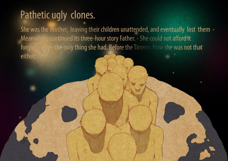 А Они улетали. Каждый день и каждый час в небо поднимались ракеты, то тут, то там превращая песок в стекло. Лишь один человек не желал улетать. И когда Она, спохватившись, увидела этого человека и поняла, что кроме него никого не осталось, и больше никто не сможет родиться, потому что он один, Она тронулась рассудком. Она начала безостановочно клонировать этого человека, пытаясь восстановить прежнее количество своего населения, не зная, а может забыв о том, что восстановить атмосферу прежних чувств и эмоций уже не удастся. У клонов не было мыслей; они не могли испытывать чувств.