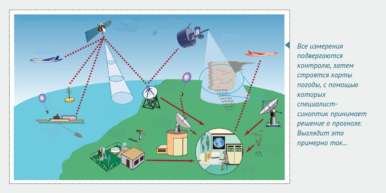 Источники для формирования прогнозов погоды очень разнообразны: это наземные и надводные метеорологические наблюдения; специализированные спутники; корабли погоды с метеорологической аппаратурой; станции зондирования лазером или радиолокаторами. Все измерения стекаются в региональные центры, рассредоточенные по всему миру. Эти данные подвергаются контролю, сначала автоматическому, а в сложно диагностируемых случаях – экспертному контролю специалистов. Затем строятся карты погоды, с помощью которых специалист-синоптик принимает решение о прогнозе.