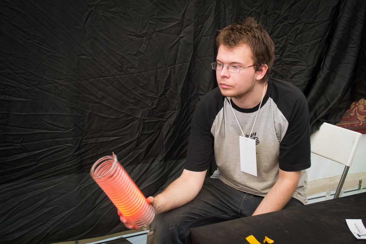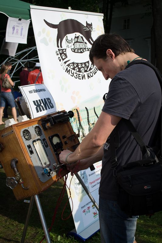Группа TeslaCoilRu с полуинтерактивной стационарной выставкой, включающей в себя небольшие катушки Тесла и плазменные шары.