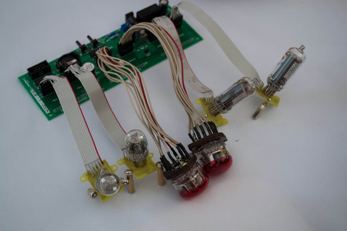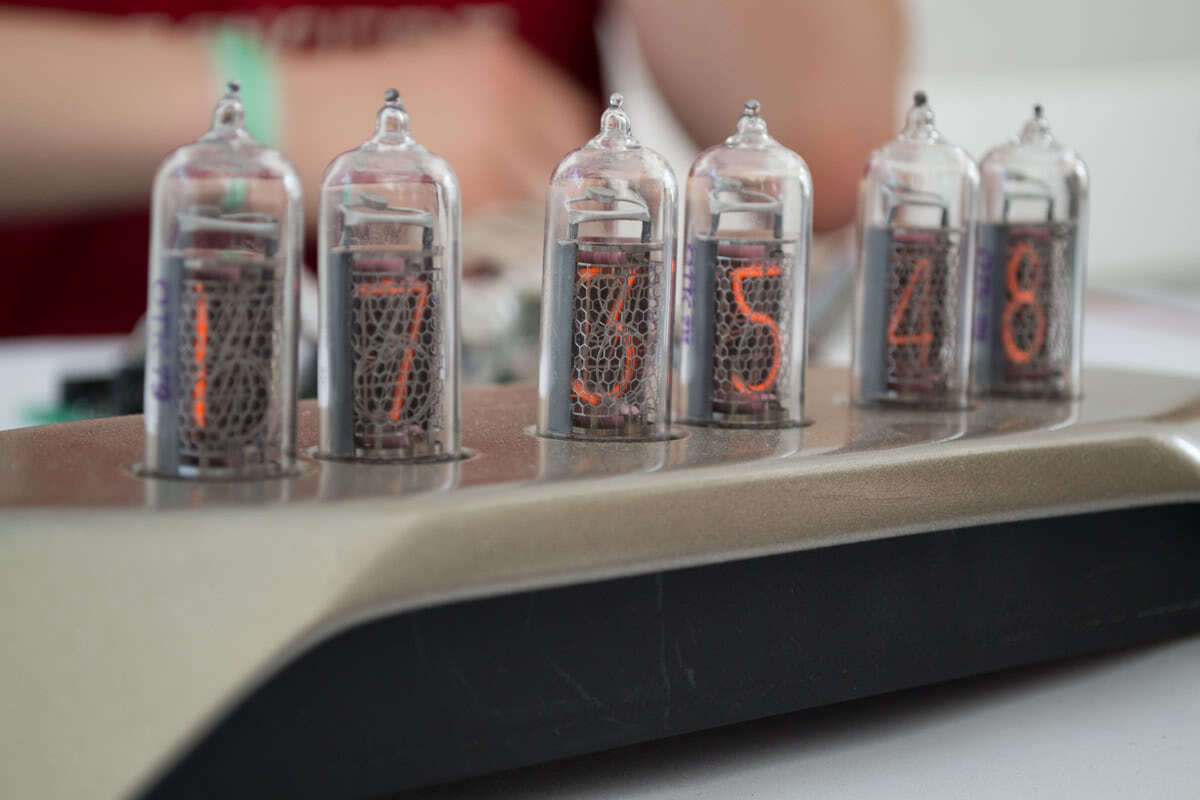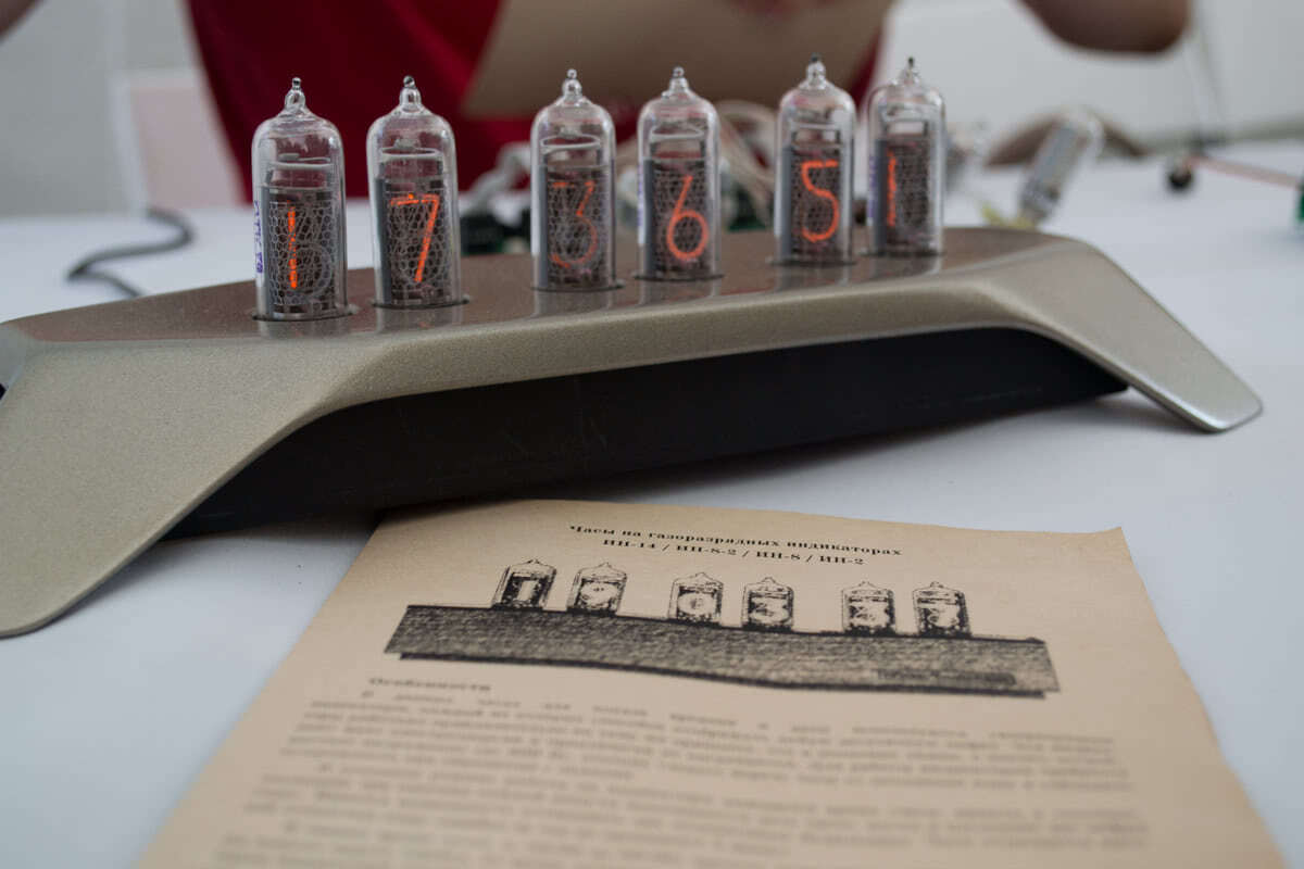 А это часы на газоразрядных индикаторах. Их необычность заключается в том, что индикация времени осуществляется при помощи цифровых индикаторных ламп. Таких ламп когда-то было выпущено огромное количество. Использовались они во многих измерительных устройствах. Но после появления светодиодных индикаторов лампы постепенно вышли из употребления.
