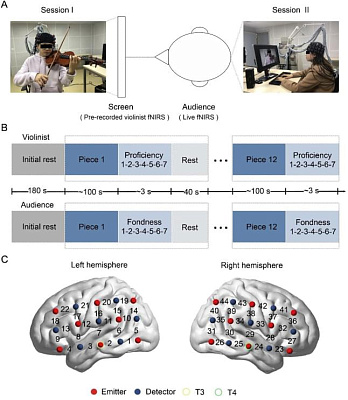 Группа учёных-когнитивистов из Китая провели эксперимент. Они предложили профессиональному скрипачу записать на видео репертуар из двенадцати 100-секундных композиций для 16 физически и психически здоровых женщин. Пока музыкант играл, активность его мозга фиксировалась с помощью инфракрасной спектроскопии. С помощью той же инфракрасной спектроскопии отслеживалась деятельность мозга и у слушательниц при просмотре клипов.
