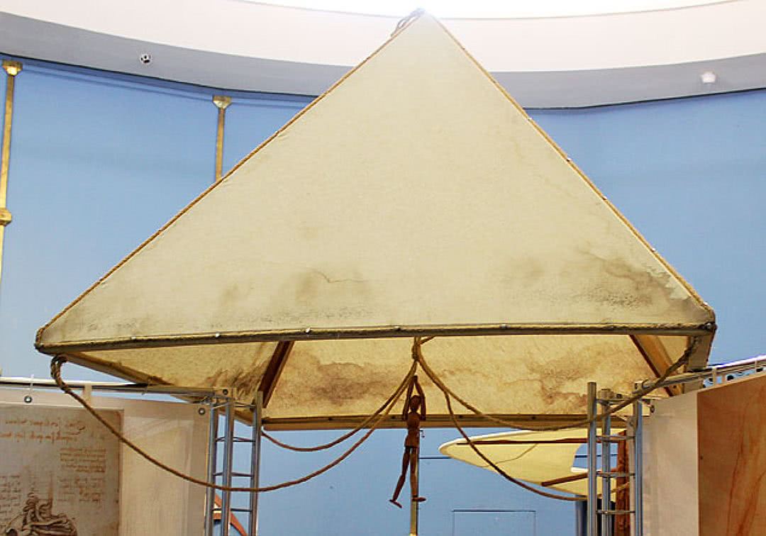 Так вот! Первый эскиз парашюта нарисовал Леонардо да Винчи в 1483 году. «Если у человека есть шатёр из накрахмаленного полотна шириной в 12 локтей и вышиной в 12, – писал гениальный ученый, – то он сможет бросаться с любой высоты, без опасности для себя». Парашют Леонардо был похож на современный, однако отсутствие практической надобности в его применении
