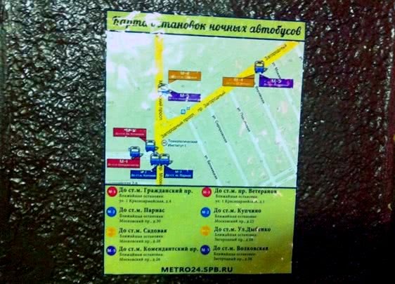 Зато активисты (авторы петербургской акции против закона о прописке) уже давно занялись партизанской городской навигацией. Они расклеили карты остановок ночных автобусов у входов в метро. На плакатах формата А4 — фрагмент Google Maps. На нём синими значками отмечены остановки, а рядом есть сноска с пояснением, какую именно линию подземки дублирует маршрут. Кроме того, под картой указано, в каком направлении движется прибывающий на остановку автобус.