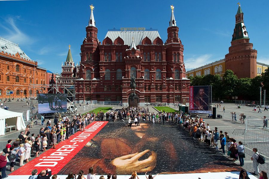 В это воскресенье (16 сентября) на Дворцовой площади соберут мозаику картины немецкого художника Альбрехта Дюрера «Автопортрет в шубе». Организаторы называют пазл самым большим в мире: он занимает площадь в 300 квадратных метров и собран из 1 023 деталей. В рамках «Года Германии в России» Дюрер-пазл уже побывал в Москве и Новосибирске. Собрать его планируют за три часа — с 12:00 до 15:00.