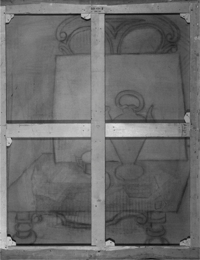 Черно-белое инфракрасное изображение задней части холста показывает темные контуры кувшина и кружки. Оба предмета лежат на стуле. Ученые предполагают, что прямоугольник может быть газетой. Хотя и первое, и окончательные изображения являются сценами интерьера, они были выполнены в совершенно разных стилях. По сравнению с узнаваемыми фигурами кувшина и стула на первом изображении, окончательный натюрморт является абстрактным.