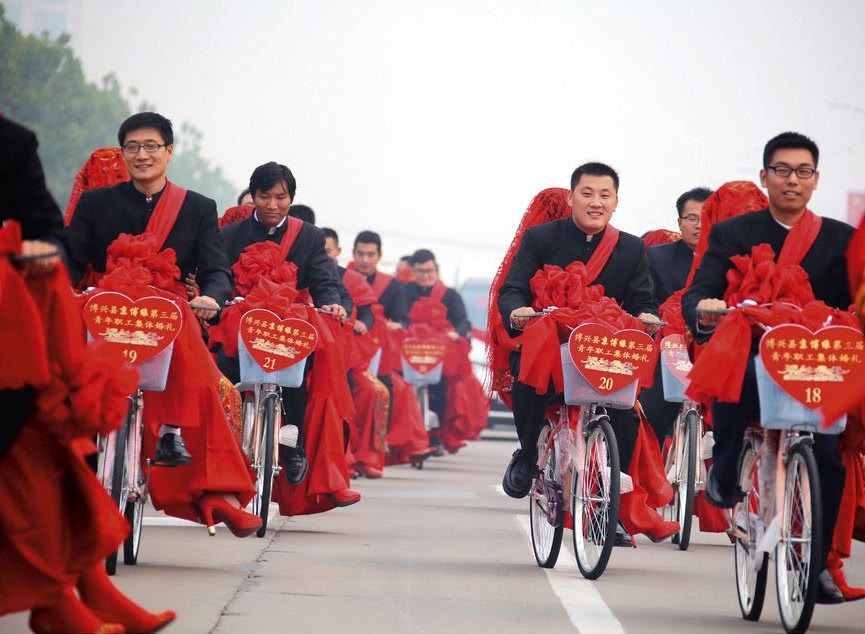 35 пар молодоженов катаются на велосипедах во время групповой свадьбы в провинции Шаньдун