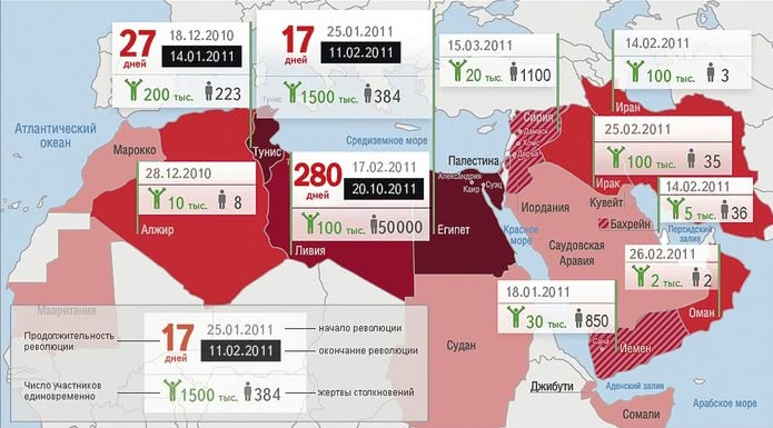 Вся «арабская весна», по сути, уложилась в три зимних месяца (хотя кое-где выступления продолжаются до сих пор). В середине декабря 2010-го вспыхнул Тунис, а к февралю 2011-го волна протестов прокатилась почти по 20 странам.