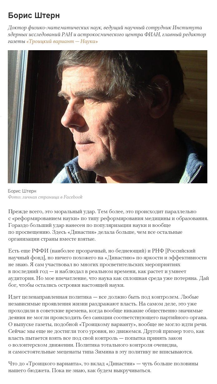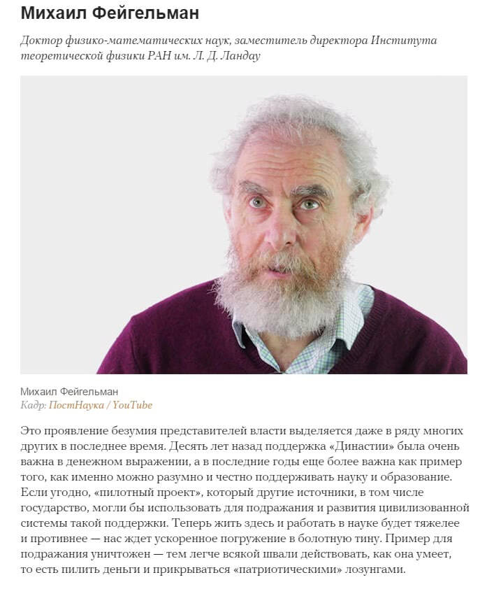 Всё это говорит о том, что у власти находятся невежественные люди! "Династия" можно сказать, единственный отечественный фонд, который как-то может поддержать на плаву российские научные фундаментальные исследования! Ведь, зарплаты у нас, учёных, смешные! После окончания СПбГУ молодые специалисты уезжают делать науку за рубеж, или уходят в коммерцию здесь, в России. И только единицы остаются работать на Родине, как говорится, "за идею". И тут такой удар под дых загибающейся Российской науке!