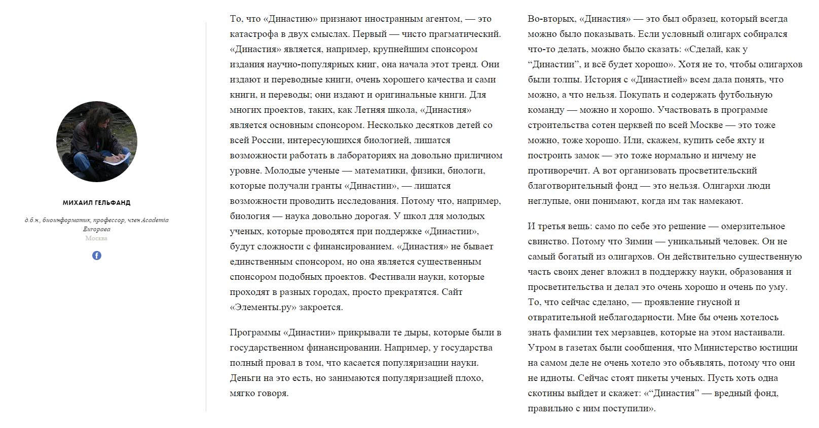 25 мая Министерство юстиции признало фонд поддержки науки «Династия» иностранным агентом. А это, между прочим, первый частный фонд, созданный в России в 2002 году для поддержки науки и образования. Вся его деятельность направлена на развитие фундаментальной науки и образования в России, создание условий для работы ученых на родине, популяризацию науки и просвещение. Особая гордость Фонда — научно-популярный сайт о фундаментальной науке «Элементы» и издательский проект «Библиотека Фонда «Династия», благодаря которому российский читатель получил возможность знакомиться с мировыми бестселлерами научно-популярной литературы. А в 2008 г. фонд «Династия» учредил премию в области русскоязычной литературы нон-фикшн — «Просветитель». И весь фонд существует на личные средства Дмитрия Зимина.