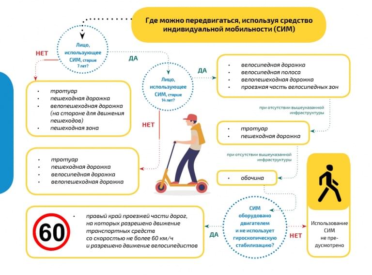 В нынешней редакции ПДД пешеходы (то есть и самокатчики) обязаны передвигаться только по тротуарам. В 2019 году Министерство транспорта и Госавтоинспекция разработали поправки в существующие правила и ввели понятие «средство индивидуальной мобильности» (СИМ). К СИМ относятся обычные и электрические самокаты, гироскутеры, моноколеса, скейты и ролики. Сейчас проект поправок лишь обсуждают, но если их согласуют, то владельцев СИМов обяжут передвигаться по велосипедным дорожкам или тротуарам, не разгоняясь выше 20 км/ч. Если велодорожки и тротуара нет, можно будет выезжать на проезжую часть, однако самокатчики будут обязаны ехать в правом ряду (если полоса одна, то как можно правее).