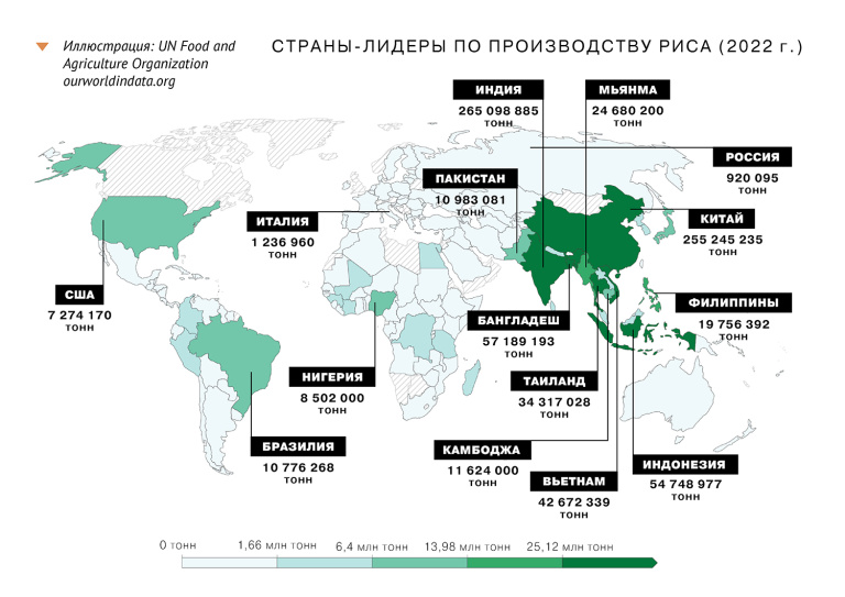 Если мы посмотрим на список стран-производителей риса, то увидим, что основные игроки данного рынка сосредоточены в регионе Юго-Восточной Азии. Здесь расположены и две ведущих «рисовых державы» планеты – Индия и Китай – выращивающие ежегодно несколько сотен миллионов тонн «белого зерна», и традиционные «рисовые государства», например, Таиланд, Бангладеш, Вьетнам, Пакистан и Индонезия, производящие рис в объемах, равных десяткам миллионов тонн. Единственной неазиатской страной в топ-10 рисовых сырьевиков является Бразилия. При этом в целом рис выращивается более чем в ста странах мира, расположенных, как сегодня принято говорить, «на глобальном Юге» (Азия, Африка, Латинская Америка). Но в большинстве из этих стран объемы производства риса минимальны и служат для удовлетворения сугубо местного рынка. Логика «сам вырастил – сам съел» применима даже к Индии и Китаю. Стран же, составляющих клуб «рисовых гигантов», то есть производящих около или более миллиона тонн риса в год, примерно сорок штук. В этот клуб, хотя и замыкая список, входит и Россия, которая по итогам 2024 года собрала 1,2588 миллиона тонн риса.