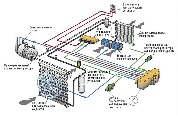 В компрессоре происходит сжатие и сильное нагревание газообразного фреона. Затем разогретый фреон попадает в конденсор, где охлаждается с помощью вентилятора, а на ходу еще и потоком воздуха. Сжатый охлажденный фреон начинает конденсироваться, превращаясь в жидкость, и в таком виде проходит через ресивер-осушитель. Здесь он очищается от грязи, залетевшей в систему с улицы. Фреон течет в сторону салона автомобиля, по дороге пройдя через терморегулирующий вентиль. Попадая в испаритель, он из жидкого состояния переходит в газообразное и при этом сильно охлаждается. (Испаритель – это радиатор, но только меньших размеров.) Потом вентилятор сдувает в салон автомобиля с испарителя прохладный воздух. Все еще достаточно холодный фреон, пройдя через испаритель, попадает вновь в компрессор.