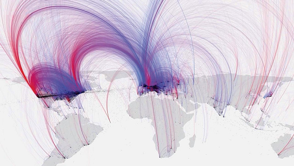 Культурная история человечества. Ученые из Университета Техаса в Далласе поместили на карту 120 тыс. известных деятелей культуры и их перемещения в мире. Синей точкой обозначалось рождение, красной — смерть. На карте видно, что основной культурный пласт приходится на Европу. www.rollingalpha.com