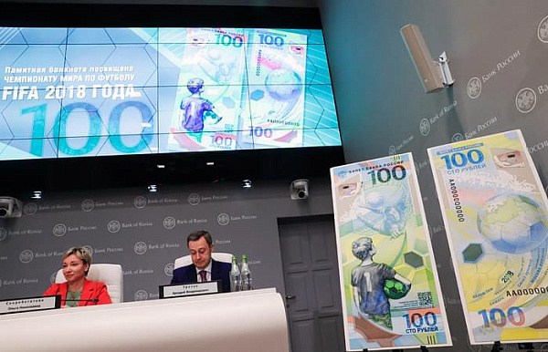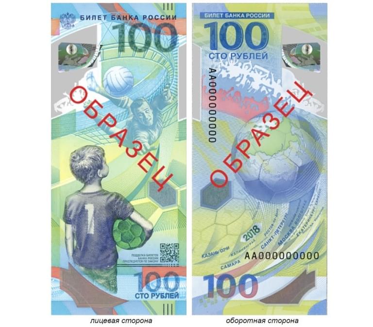 Перед началом Чемпионата мира по футболу Центробанк выпустил памятную купюру номиналом в 100 рублей. Это первая банкнота Банка России из полимера. Лицевая сторона — мальчик, вдохновляющийся великими футболистами, такими, как Лев Яшин. А оборотная — летящий футбольный мяч в виде земного шара с картой России и списком городов, принимающих ЧМ.