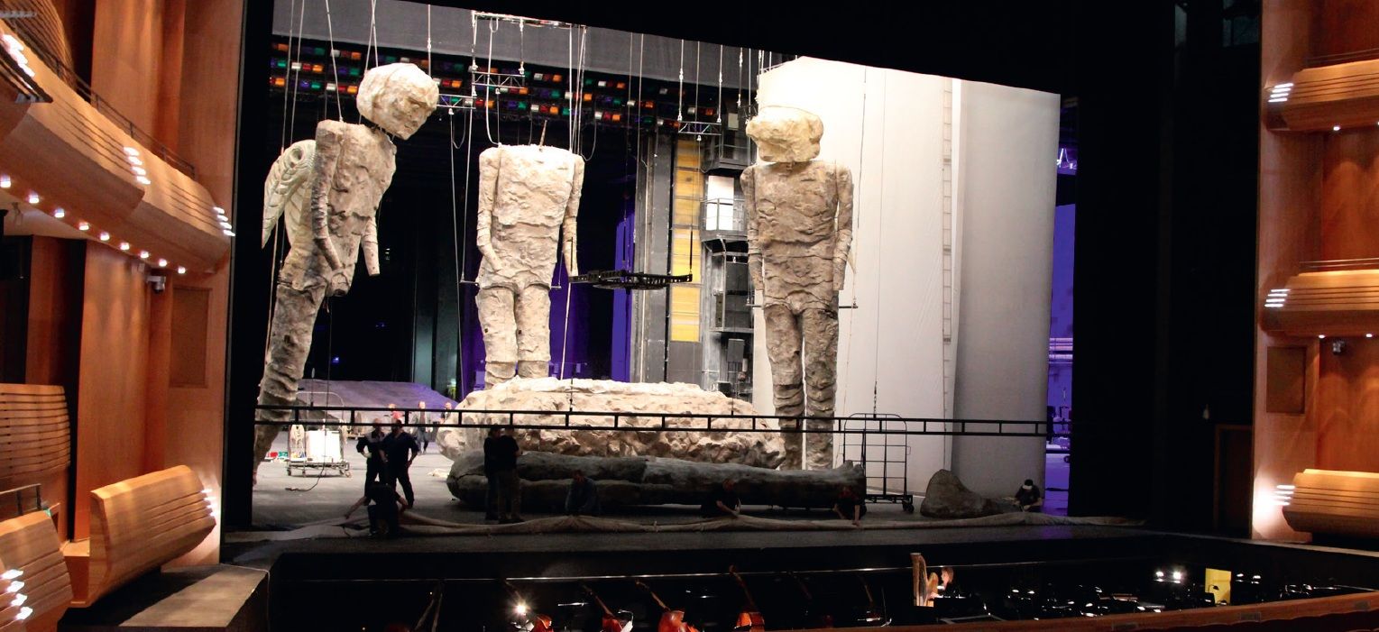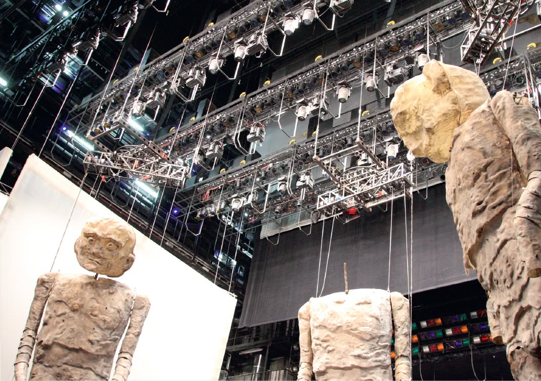 «Во время восстановления здания имперского театра после пожара была допущена ошибка: портал был построен больше заданной величины. Постепенно к этому все привыкли, и декорации стали делать исходя из этой особенности „Мариинки“. Когда начали проектировать вторую сцену, то столкнулись с проблемой: если делать портал стандартным, то большая часть декораций будет просто не пригодна. И было решено оставить этот необычный, исторически сложившийся размер», – Кшиштоф Поморский ведет нас на сцену, где идет монтаж огромных декораций к опере «Кольцо Нибелунгов». На сцене и за ней своего часа ждут огромные валуны: на вид – каменные, на ощупь – пластиковые.