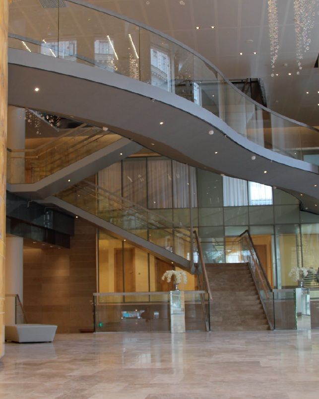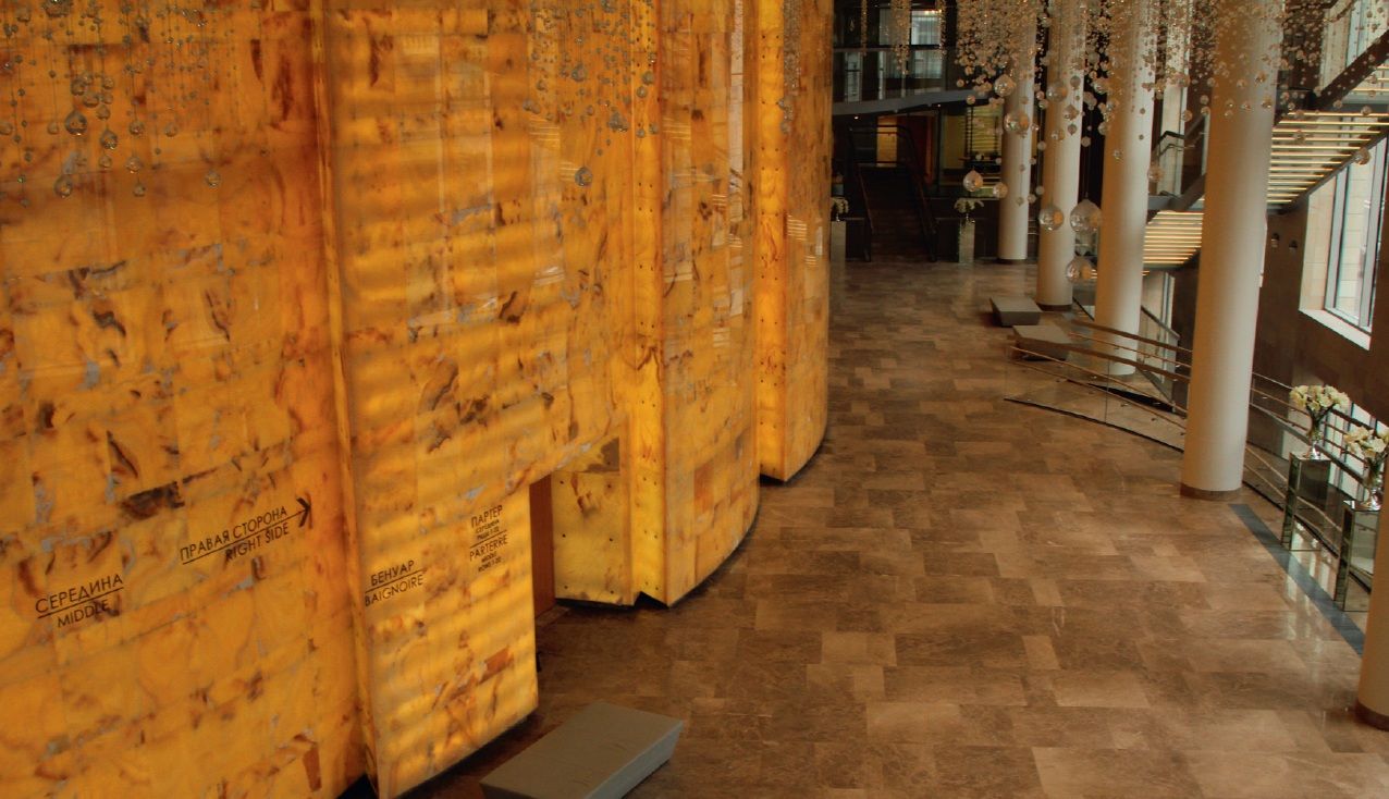 Фраза о том, что театр начинается с вешалки, для новой «Мариинки», пожалуй, не актуальна. Зрителей уже на подходе к зданию встречает главная интерьерная гордость театра. Самая большая «лампа» в Европе – подсвеченная светодиодами ониксовая стена площадью 4 тыс. м2 – через широкие фасадные окна мягко освещает и часть улицы Декабристов, и воды Крюкова канала. Между прочим, камень, прежде чем попасть в Петербург, путь проделал немалый: его добывали в Иране, а обрабатывали в Италии.